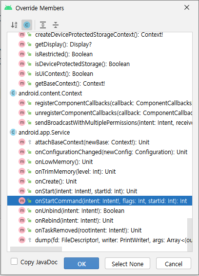 다른 Component에 의해 서비스가 시작되면 onStartCommand() 메서드가 실행되기 때문에 onStartCommand()를 override해줘서 service가 시작되면서 실행할 내용을 작성해준다.